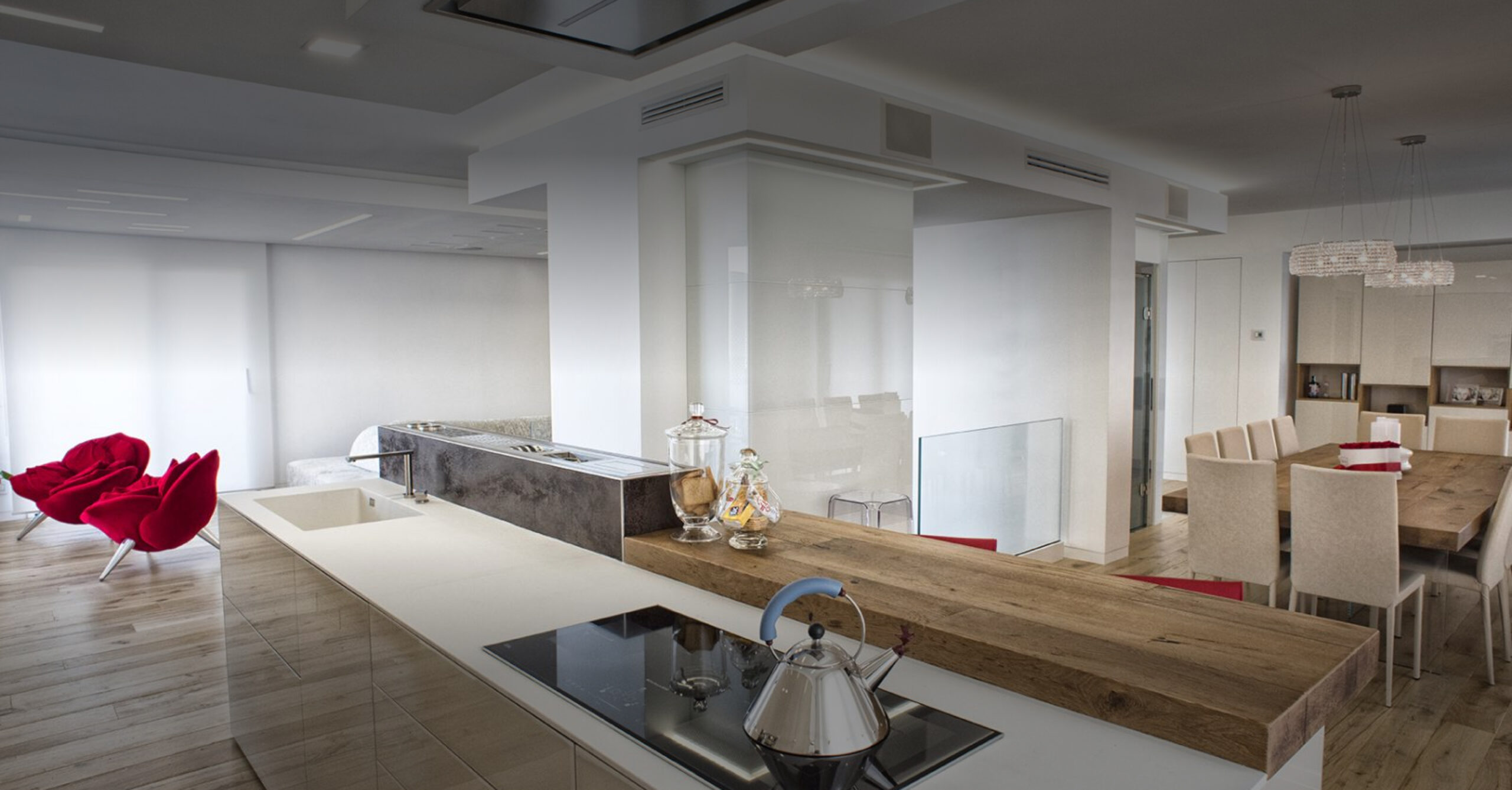Il team di Addessi Design ha realizzato un progetto di restyling che ha trasformato l’appartamento in un ambiente fluido e armonioso. Gli spazi sono stati divisi con leggerezza e funzionalità, con una continua visibilità tra la zona living e il terrazzo. La zona notte è stata suddivisa in tre unità distinte, simili a suite, con cabine armadio e bagni personali. Il progetto ha coinvolto numerosi marchi prestigiosi per mobili e arredi, come Caccaro, Flou, Lago Design, Edra e molti altri. Gli spazi includono disimpegno, soggiorno-cucina, bagni, camere da letto e lavanderia, con arredi e materiali di alta qualità, garantendo un risultato finale che riflette la visione e le esigenze della famiglia.